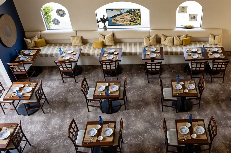 For this branding pack, this client wanted to refresh their visual identity and decided to go to a bright mediterranean identity with a strong colour palette in yellow and blue. From this bright logo and colour chart created for this beautiful restaurant, we redefined different spaces and embraced this new identity in the colour palette. A banquette has been created to really add an atmosphere to the main dining area and add a dimed lighting to accentuate the colour contrast in the night. In the private dining part, we selected the darker side of the palette to really create a moody chic atmosphere